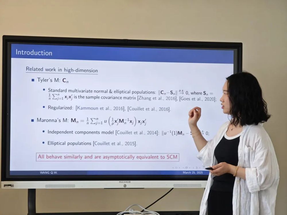 在报告中,王勤文教授详细介绍了泰勒M估计量在中高维度的形状矩阵测试中的应用。泰勒M估计量作为一种鲁棒的样本协方差矩阵替代方法,在鲁棒统计学中得到了广泛应用。然而,传统的泰勒M估计量理论主要集中在低维度群体,对成比例和样本增长的一般性群体的研究和应用仍然存在较大空白。