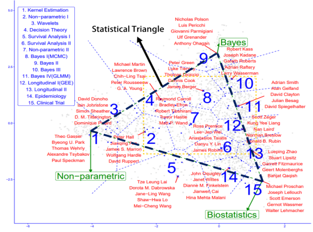 金教授还带领团队系统收集整理了统计学者的合作网络与引文网络数据集——MADStat数据集,该数据集涵盖了1975-2015年间发表在36个统计杂志上的83331篇论文文本和引用数据,是第一个关于统计学论文的大型多属性高质量现代数据集,为统计和机器学习等领域提供了有价值的数据资源。基于MADStat数据集,团队设计了现在广为人知的统计三角形(见图1右),完美的印证了非负矩阵谱空间的单纯形结构。