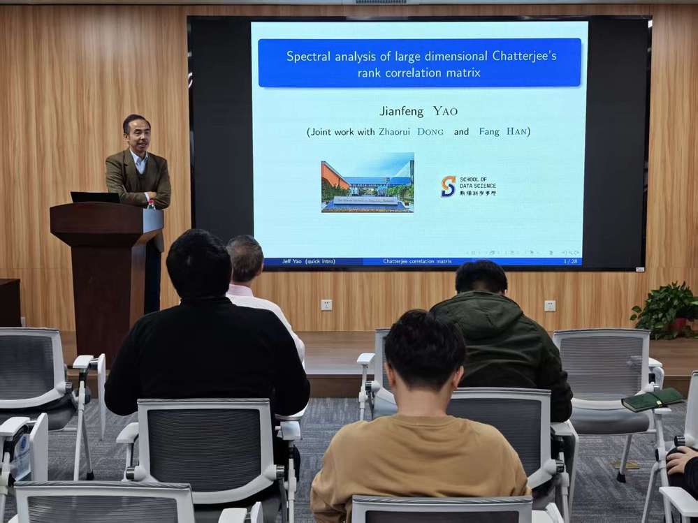 2026年1月4日下午,必威betway西汉姆在九龙湖校区文科综合楼1801室举办了新年首场学术讲座,同时也宣告学院新设的学术品牌“兰台大讲堂”正式启动。应金加顺老师邀请,香港中文大学(深圳)校长讲座教授姚建峰作为首期主讲人,带来题为“Spectral analysis of large dimensional Chatterjee's rank correlation matrix”的报告。