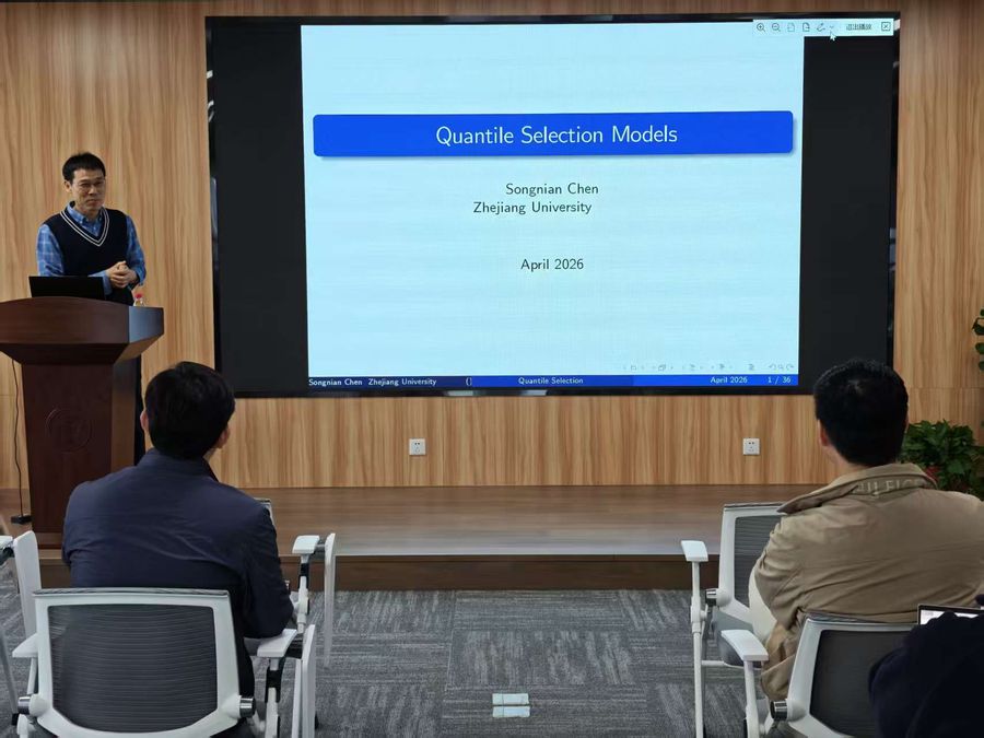 2026年4月23日,必威betway西汉姆迎来了本周第二场“兰台大讲堂”。受学院孔新兵教授邀请,浙江大学陈松年教授莅临我院,为师生带来了题为“Quantile Selection Models”的精彩学术报告。活动吸引了许多院内师生踊跃参会,共同探讨微观计量经济学与高维统计交叉领域的前沿热点。